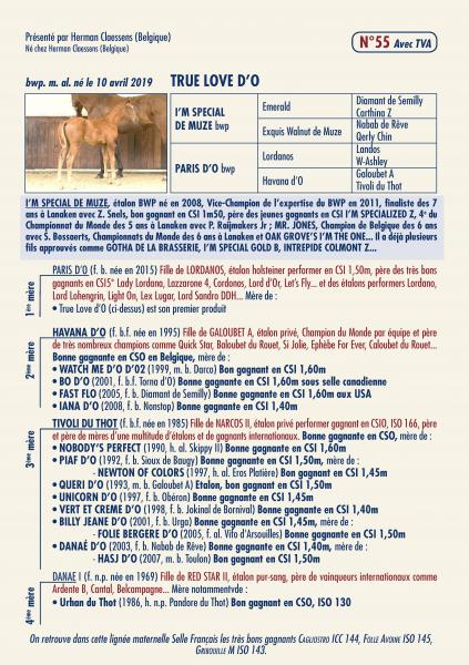 The 2nd dame of True Love d'O is Havana d'O (Galoubet A x Narcos), who is the mother of several international jumping horses including Fast Flo, Watch me and Bo (AKA Eleonora).